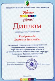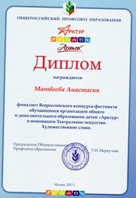 Поздравляем Кондратьеву Людмилу Васильевну и ее ученицу Матвееву Анастасию с победой во Всероссийском конкурсе-фестивале обучающихся организаций общего и дополнительного образования детей «Арктур»!