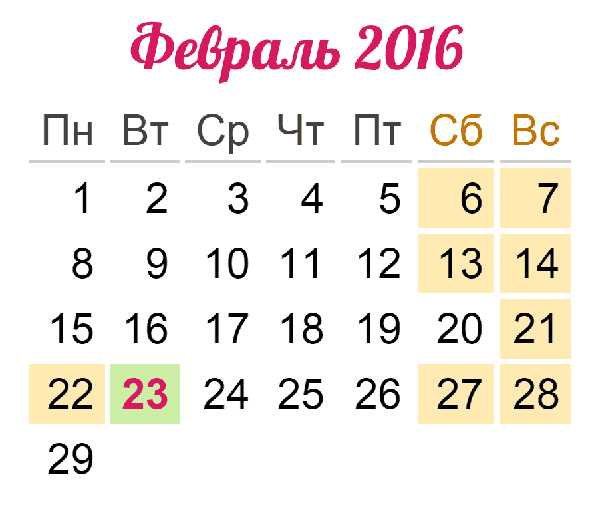 Иркутская областная организация Общероссийского Профсоюза образования сообщает о переносе выходных и праздничных дней в феврале 2016 года следующее.В соответствии с частью 1 статьи 112 Трудового кодекса Российской Федерации в число нерабочих праздничных дней в Российской Федерации входит 23 февраля (День защитника Отечества), 22 февраля является предпраздничным днем.